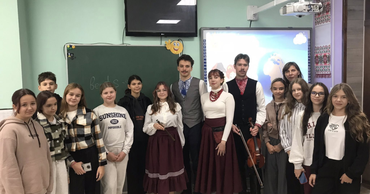 Скрипаль квартету студентів-істориків Іван Коваленко, цікаво та доступно розповів учням 7, 5-А та 5-Б класів про родзинки та історію української народної музичної спадщини, про троїстих музик та інструменти, які найчастіше використовує тріо, про милозвучність, красу та неповторність української мови та пісні.