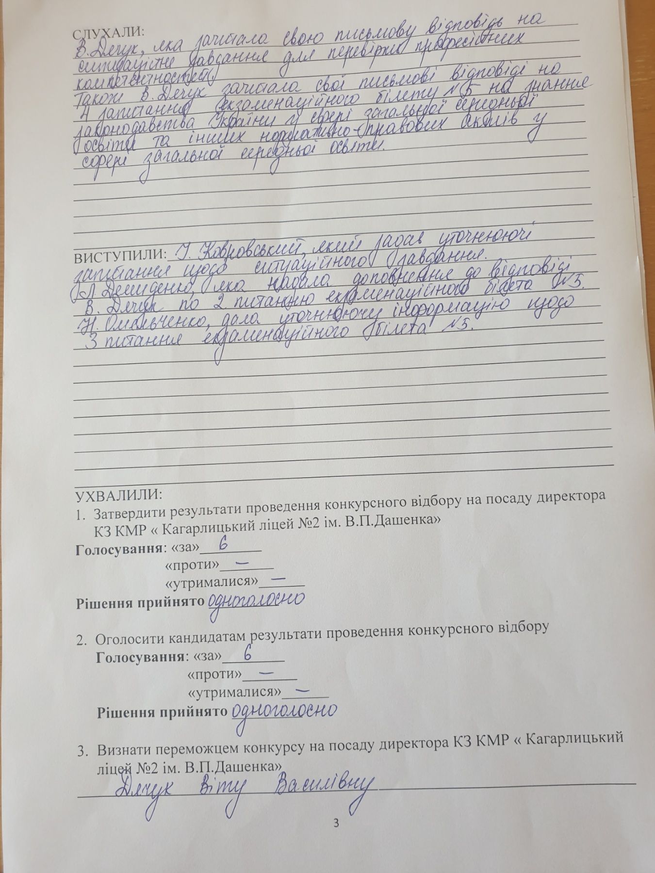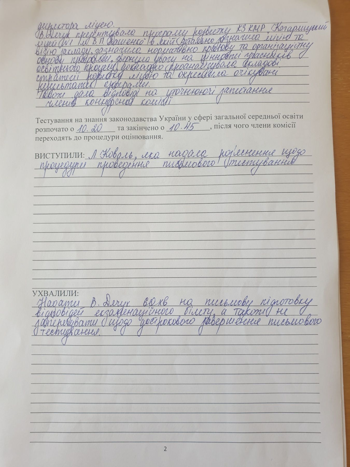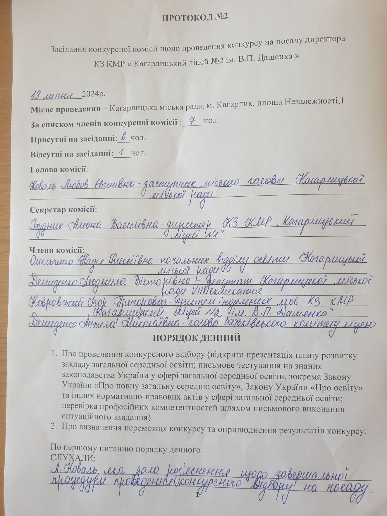ПРОТОКОЛ № 2. Засідання конкурсної комісії щодо проведення конкурсу на посаду директора КЗ КМР "Кагарлицький ліцей № 2 ім. В. П. Дашенка"