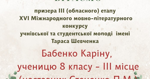 Вітаємо призерку ІІІ (обласного) етапу ХVІ Міжнародного мовно-літературного конкурсу учнівської та студентської молоді імені Тараса Шевченка Каріна Бабенко. Молодець. Так тримати!